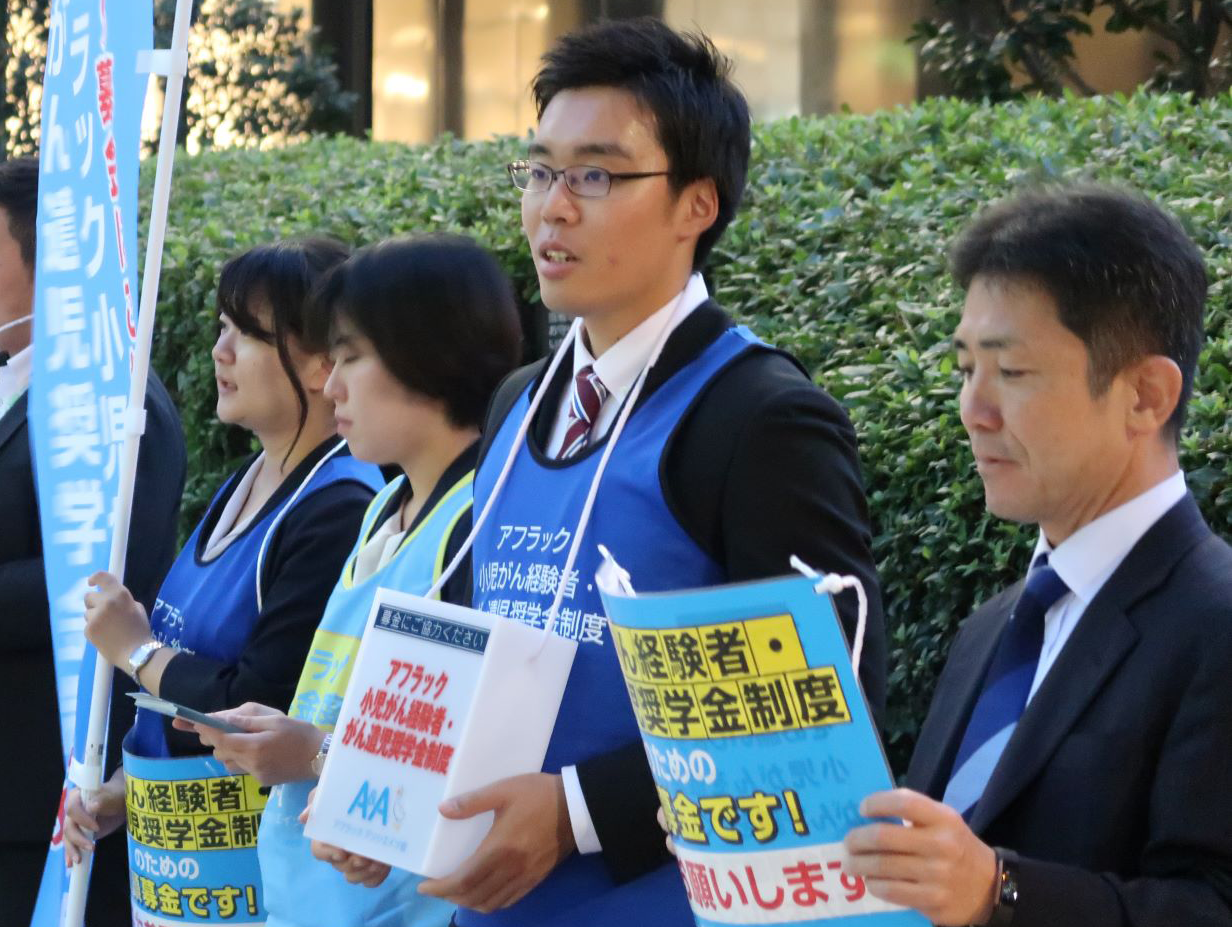 「アフラック小児がん経験者・がん遺児奨学金制度」を支える活動として実施される街頭募金活動に、継続して参加しています。同活動は当社が加盟する「アフラック全国アソシエイツ会」が主体として行われています。