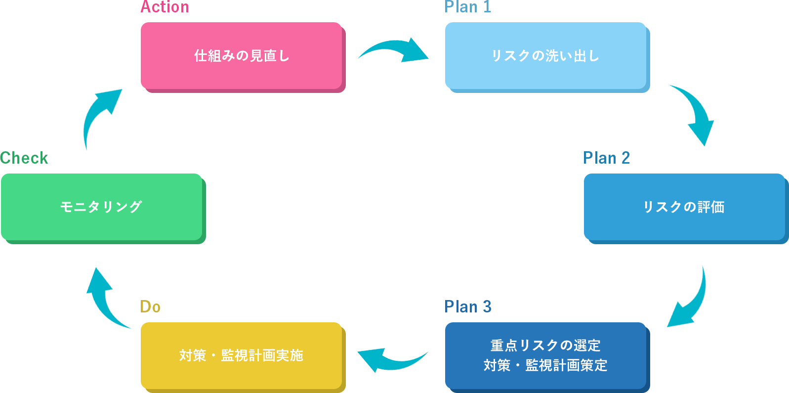 当社のリスクマネジメント活動は、各事業部門毎に作成するリスク管理台帳を活用して、リスクの洗い出しと計画策定(Plan)、実施(Do)、評価(Check)、是正(Action)の各段階から構成されるリスクマネジメントサイクル(PDCA)に則って実施します。