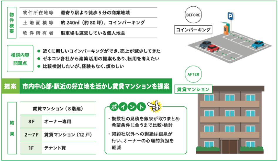 “コインパーキング”から“賃貸マンション”へ(業態転換による収入アップ)